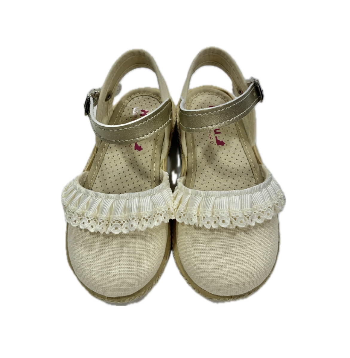 Agrega un toque de elegancia al estilo de tu pequeña! Estas hermosas sandalias blancas están adornadas con un delicado encaje en la parte delantera y una correa dorada ajustable que les da un toque de sofisticación. Con una cómoda suela de esparto, son perfectas para cualquier ocasión, ya sea un día de paseo o un evento especial. Hechas en España con materiales de alta calidad, estas sandalias son la opción ideal para mantener a tu hija cómoda y con estilo.