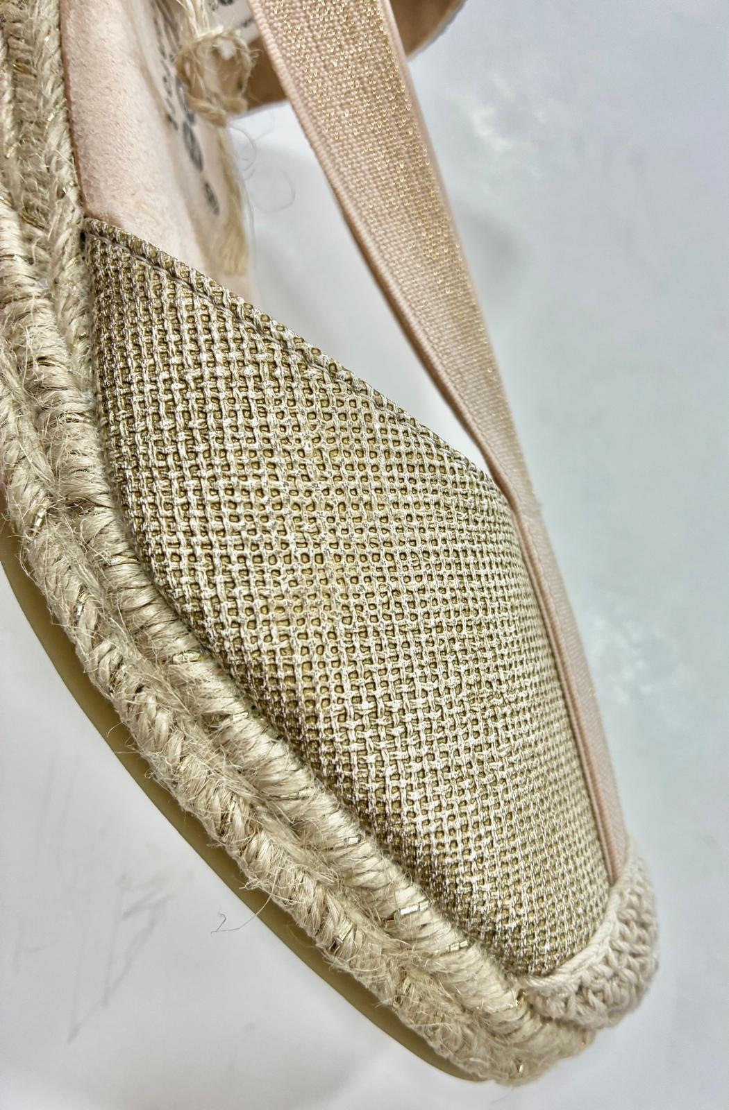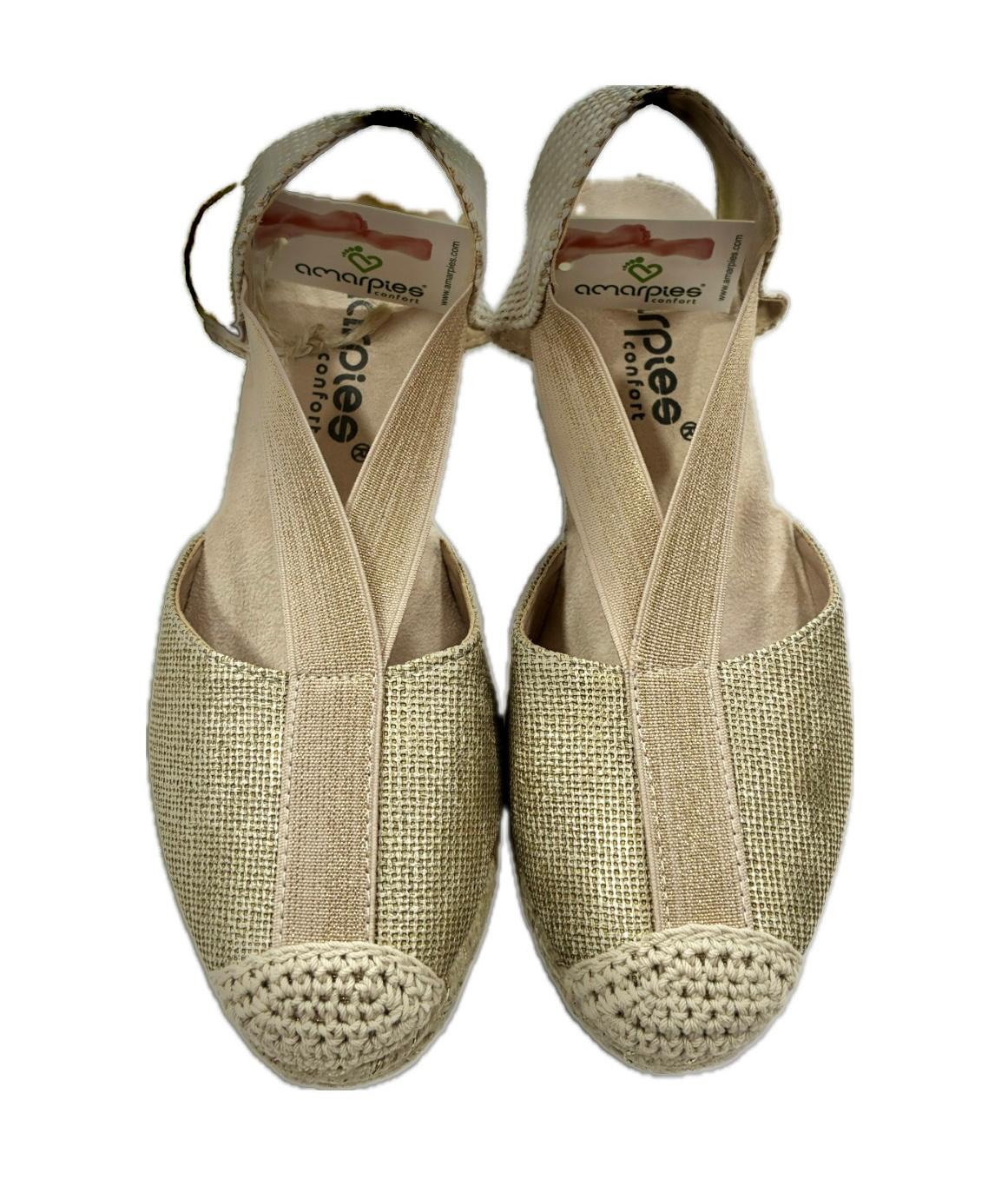 Alpargata de Yute de la marca Amarpies, con plantilla de memory, cinta elástica y de color satinado, en tejido metalizado, suela de 2 cm y cuña de 3 cm.