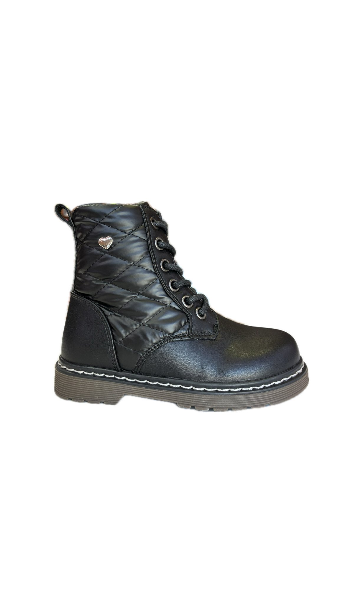 Bota negra con diseño acolchado, cordones frontales y detalle metálico en forma de corazón. Suela resistente con costura decorativa.